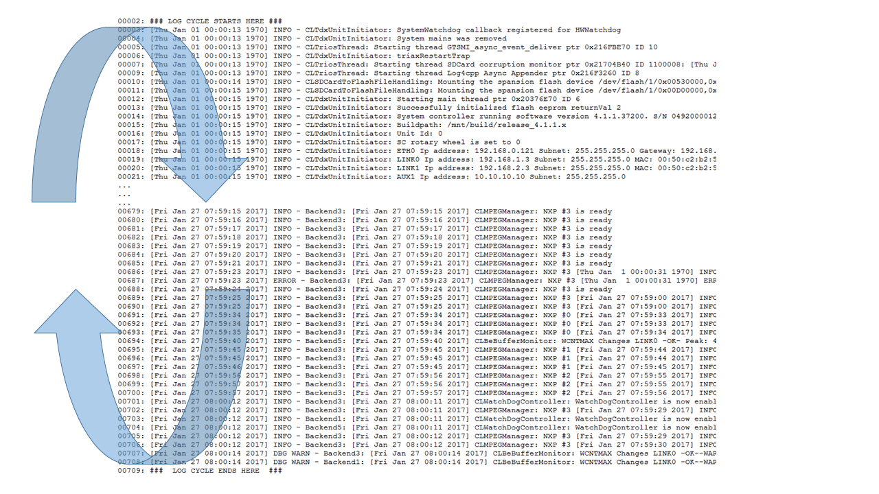 00001: ### LOG CYCLE STARTS HERE ### 00002: [Thu Jan 01 00:00:13 1970] INFO - CLTdxUnitInitiator: SystemWatchdog callback registered for HWWatchdog 00003: [Thu Jan 01 00:00:13 1970] INFO - CLTdxUnitInitiator: System mains was removed 00004: [Thu Jan 01 00:00:13 1970] INFO - CLTriosThread: Starting thread GTSMI_async_event_deliver ptr 0x216FBE70 ID 10 ... 00612: [Fri Jan 27 07:58:58 2017] ERROR - Backend1: [Thu Jan 01 00:00:55 1970] CLQAMManager: Systime set exceeds threshold. Current Thu Jan 01 00:00:55 1970 new Fri Jan 27 07:58:58 2017 ... 00708: [Fri Jan 27 08:00:12 2017] INFO - Backend5: [Fri Jan 27 08:00:11 2017] CLWatchDogController: WatchDogController is now enabled 00709: ### LOG CYCLE ENDS HERE ###
