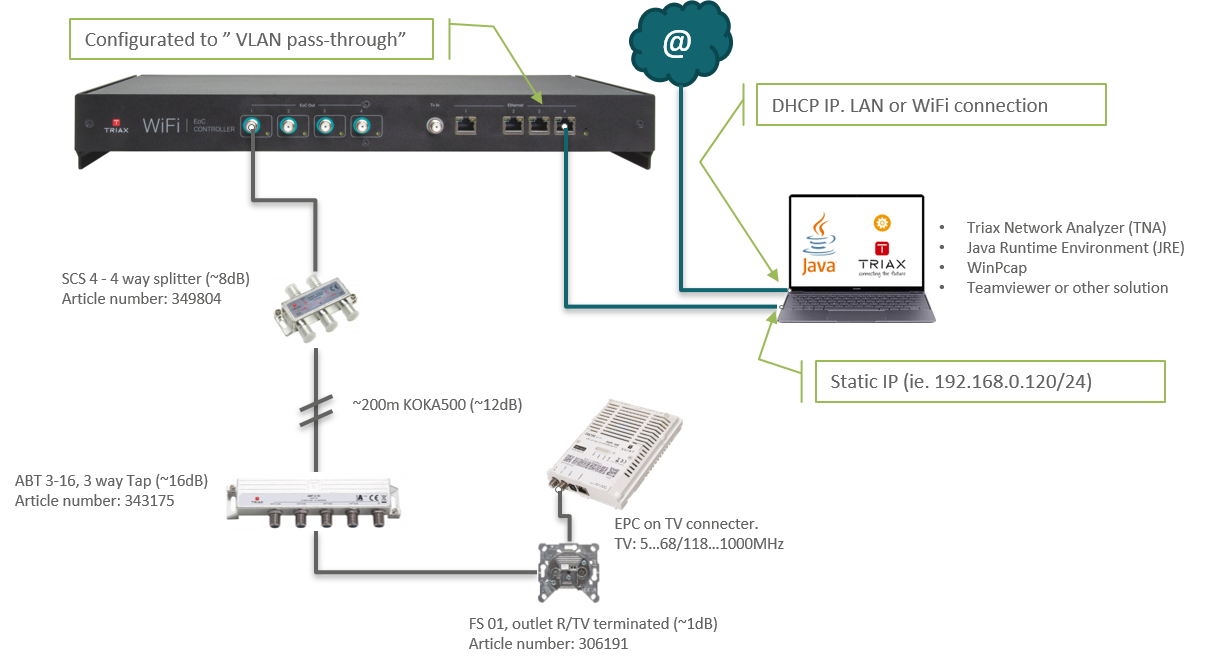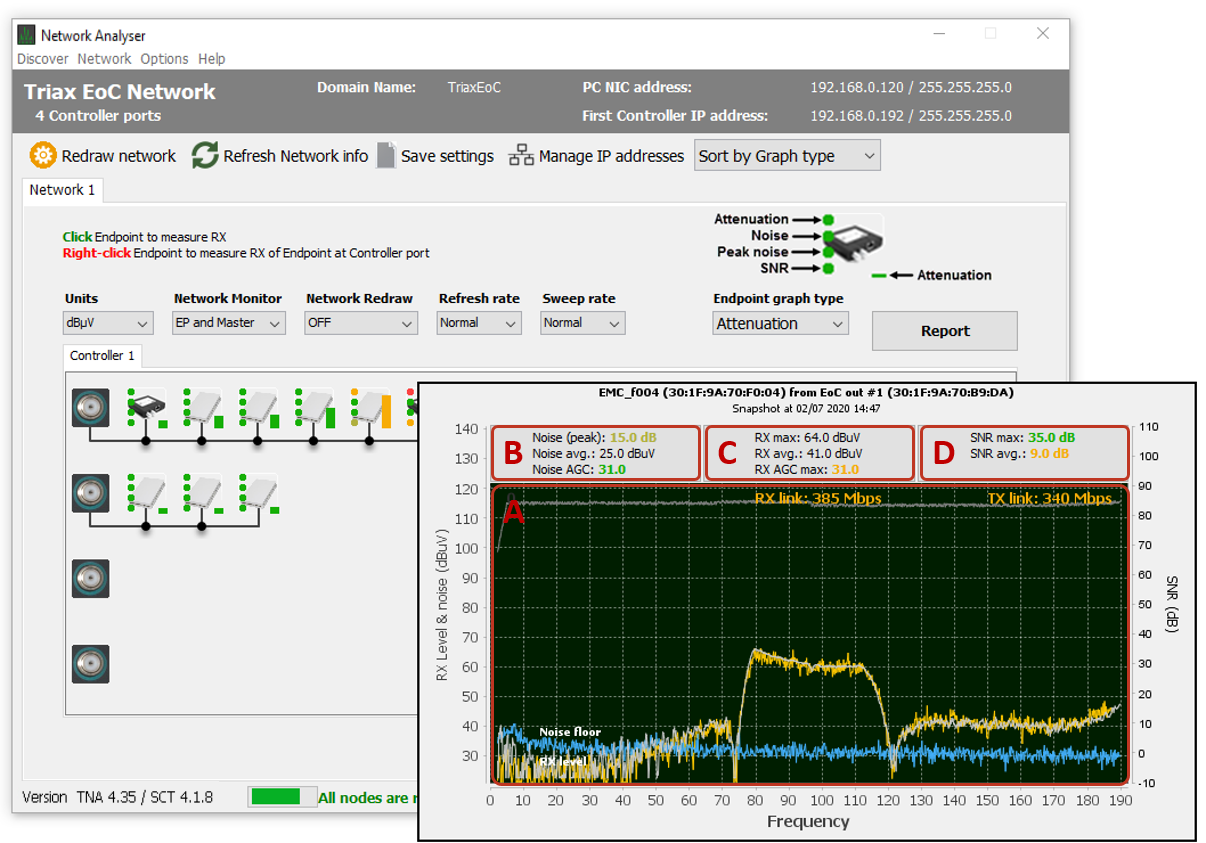 TRIAX Network Analyser operates in the area from 0-190MHz. TNA is based on core software from 3rd party and made usable without the need for deep knowledge in how G.hn works. Basic understanding of coax installation and RF networking is a minimum requirement.