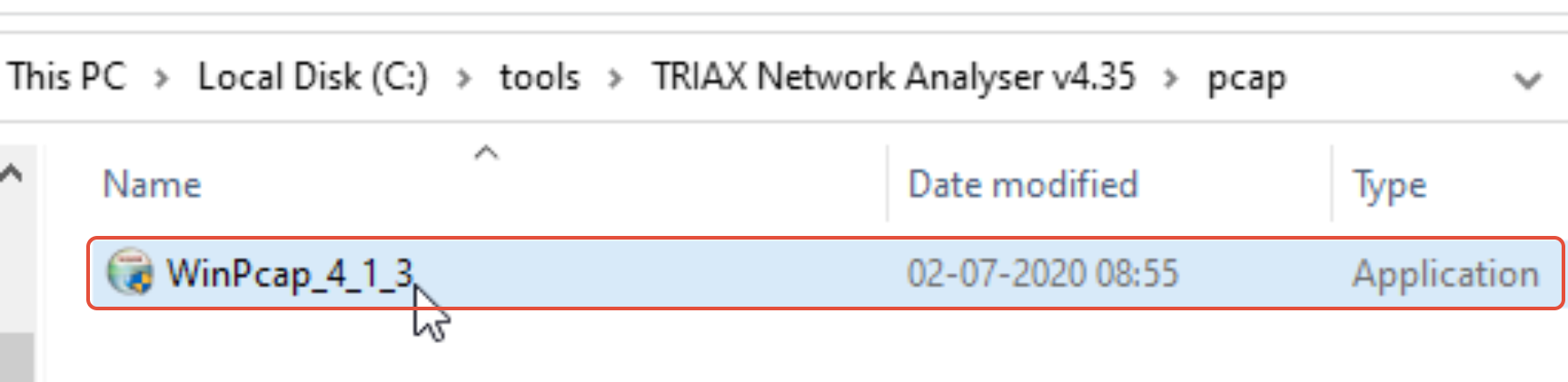 - Run the executable from WinPcap in the c:\tools\Triax_Network_Analyser_x.xx\pcap\ directory