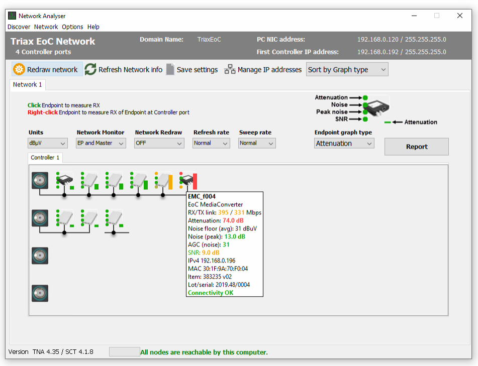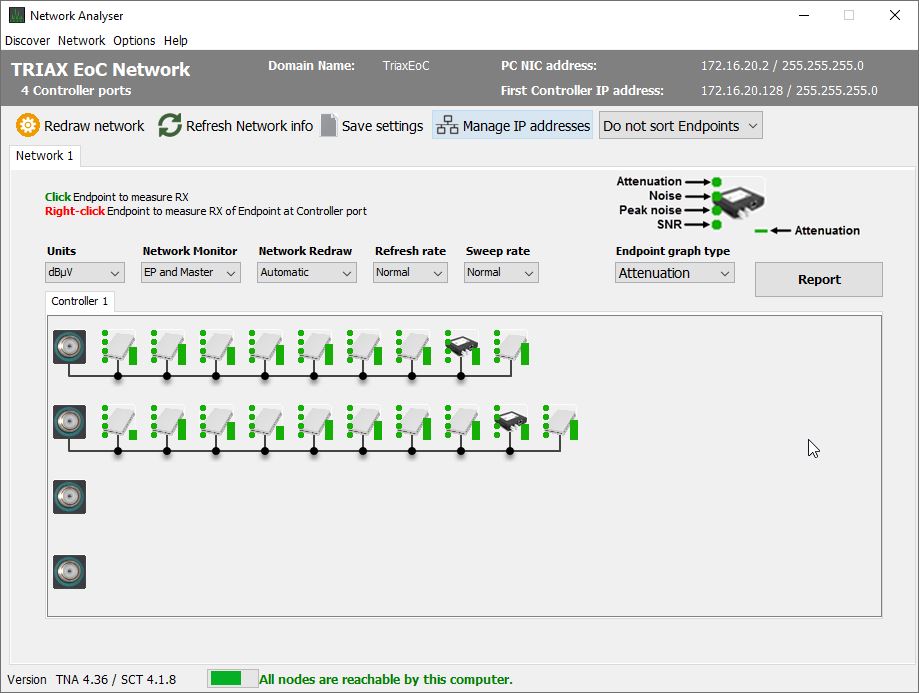 11. TNA will gather information from all connected endpoints (coax only). TNA is ready when all endpoints values are represented with coloured dots and bar graph.