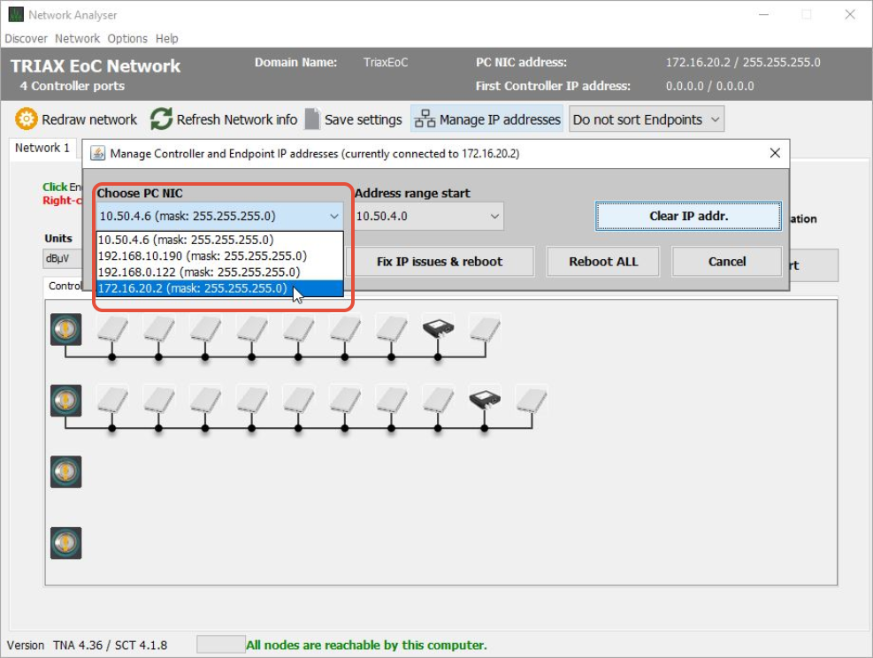 7. Depending on the number of network interfaces on the PC, you will see 1 or more possibilities in the dropdown "Choose PC NIC" menu. Here there are 4 interfaces. Select the one connected to the controller port configured previously in this guide.