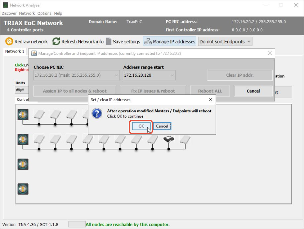 9. Acknowledge that the system will reboot endpoints and the Eoc ports on the controller (Domain masters).