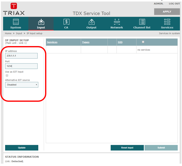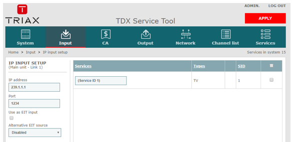 Select the INPUT tab and the Link 1 or 2 with the IPTV input.