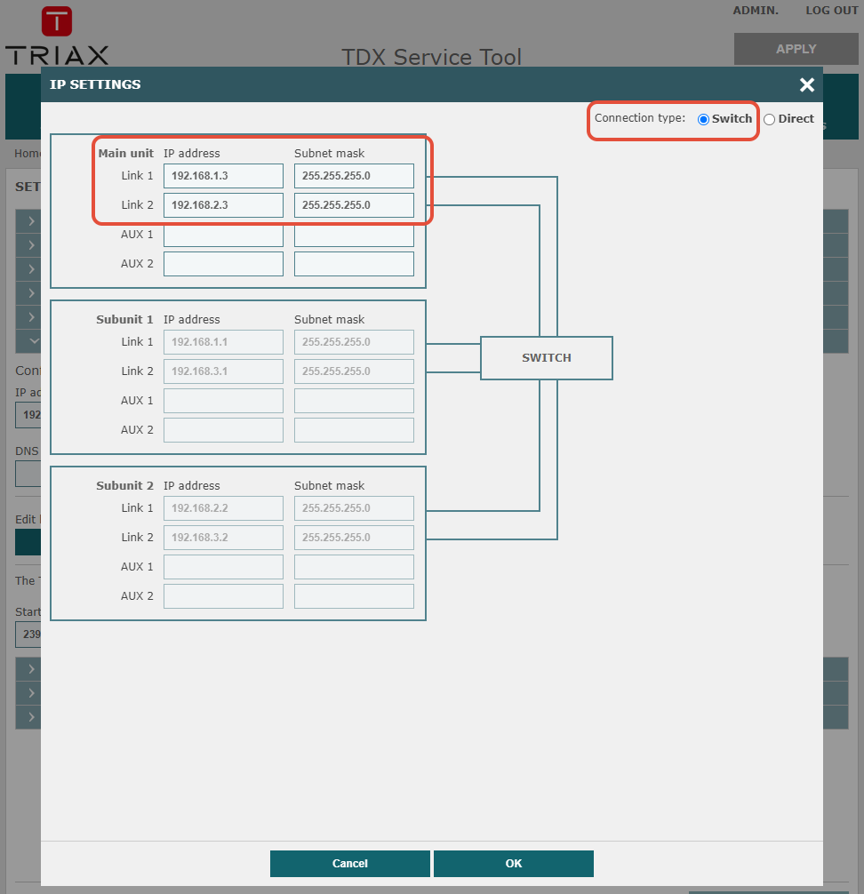 Select Switch and modify the LINK IP-adresses / subnet mask if needed.