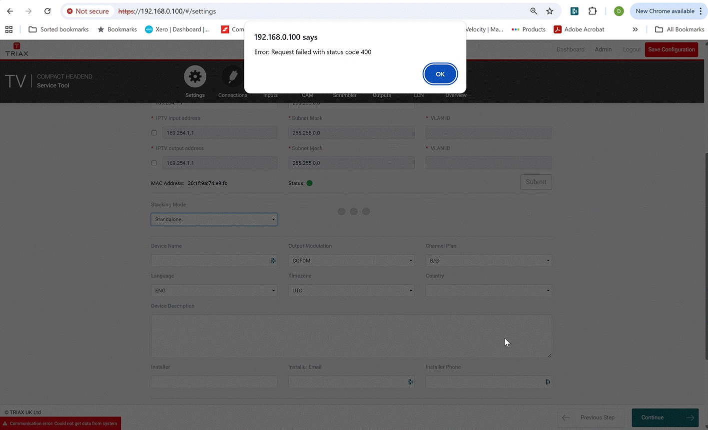 Sometimes when working on more than one Headend at a time, switching from unit to unit using the same IP address can cause strange behaviour in the GUI with error codes being displayed and the GUI becoming unresponsive and/or GUI items missing.